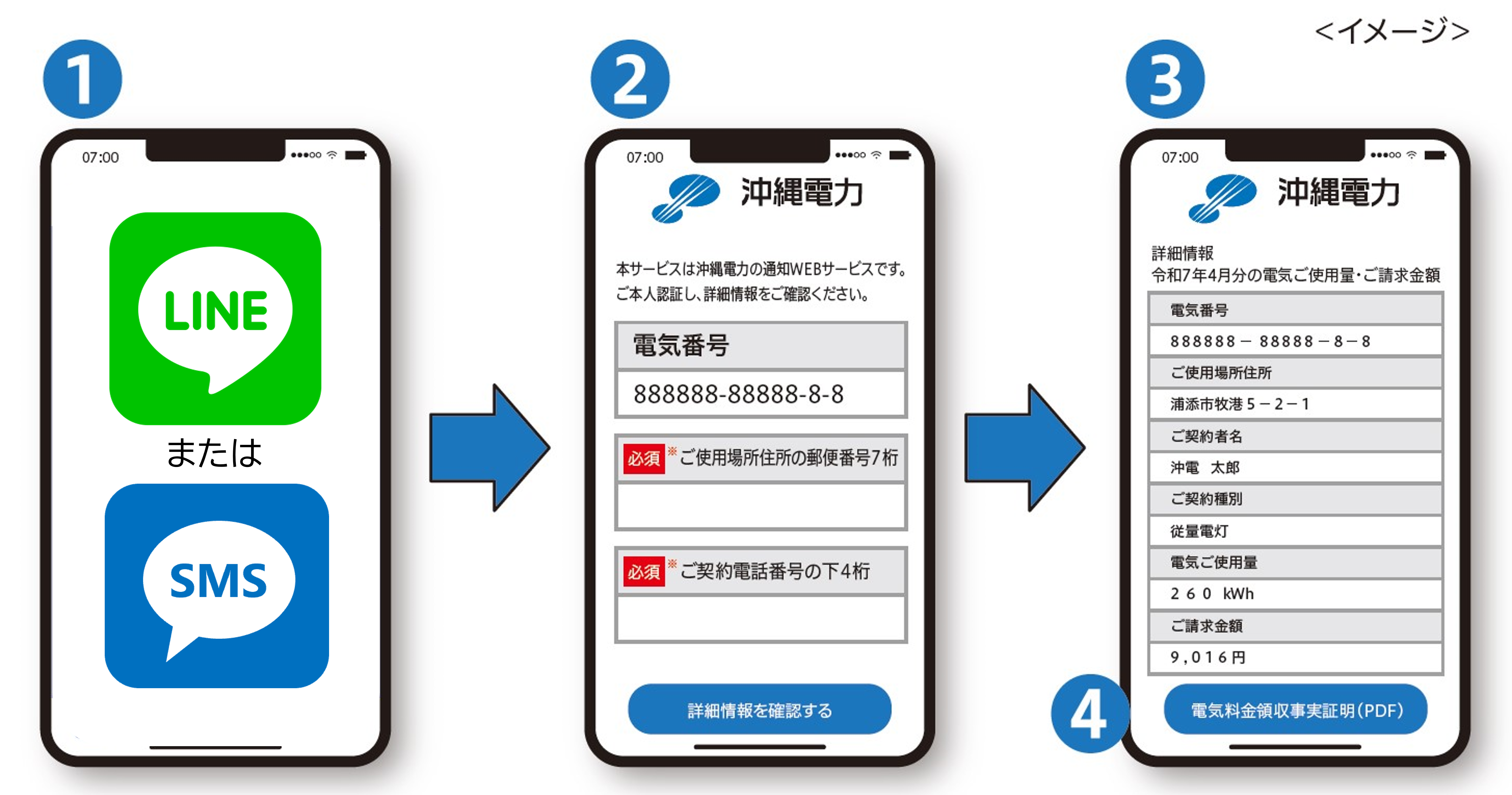 「LINE通知メッセージ」とは、LINEヤフー株式会社の提供するメッセージ配信機能です。「LINE通知メッセージ」機能の利用に同意されているお客さまを対象として、LINEアプリに登録されているユーザーの電話番号情報と、当社に登録されている電気契約者電話番号情報をマッチングし、LINEユーザーが沖縄電力LINE公式アカウントを「友だち」登録をしていない場合でも、お客さまへ配信することができます。 (LINEでのお知らせについて、新規受付を2025年11月末をもって終了いたしました。なお、LINEで検針結果のお知らせを受け取っている場合、従来どおりLINEで送信されます。)